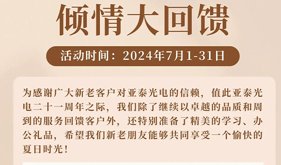 為感謝廣大新老客戶對亞泰光電的信賴,值此亞泰光電二十一周年之際,我們除了繼續(xù)以卓越的品質和周到的服務回饋客戶外,還特別準備了精美的學習、辦公禮品,希望我們新老朋友能夠共同享受一個愉快的夏日時光!
