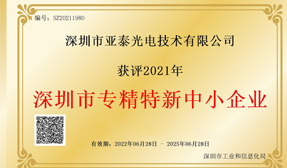 喜訊|深圳亞泰光電獲得深圳市“專精特新”企業榮譽稱號!
