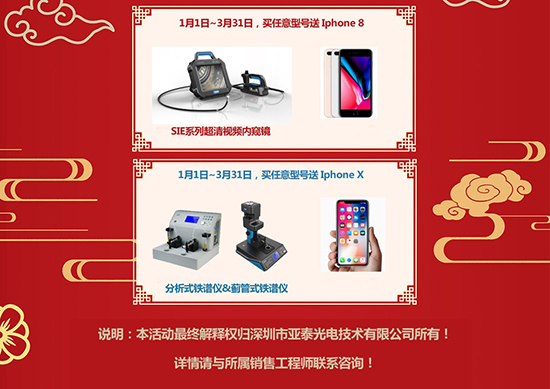 在過去的一年里,在亞泰人的共同努力下,我們?nèi)〉昧烁蟮某煽儯瑏喬┕怆姲偃f像素內(nèi)窺鏡在國內(nèi)外市場進一步拓展,經(jīng)銷商簽約量屢創(chuàng)新高,產(chǎn)品得到了國內(nèi)外市場的認可和客戶一致好評;油液事業(yè)部的油液監(jiān)測項目和眾多大型企業(yè)、高校有了更深入的合作,客戶的滿意是對亞泰人最好的獎勵,新年伊始,為回饋新老客戶對亞泰光電多年來的支持,亞泰光電新春送福送紅包,購儀器享豪禮!我們相信在亞泰人共同努力下,亞泰光電2018更上一層樓,亞泰光電愿與您一起共同攜手,共贏、共榮、共發(fā)展!