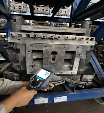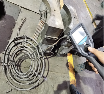 客戶現(xiàn)場(chǎng)主要看輪轂?zāi)ゾ邇?nèi)部通道的堵塞、脫落、毛刺情況,管通道孔徑13mm, 呈環(huán)狀分布,進(jìn)口5cm的位置,有雙向的分支通管,亞泰光電MIE高清系列內(nèi)窺鏡的探頭進(jìn)入導(dǎo)管后,需要分別從兩端進(jìn)入,本次演示時(shí),沒(méi)有2.8mm360°轉(zhuǎn)向的演示設(shè)備,需要手動(dòng)旋轉(zhuǎn)管線,預(yù)判轉(zhuǎn)向方位,清晰度方面客戶對(duì)MIE內(nèi)窺鏡非常認(rèn)可。導(dǎo)管內(nèi)部多處焊接的位置,實(shí)測(cè)時(shí)能明顯看見(jiàn)內(nèi)部的焊接堵塞,還有部分脫落,放置貨架的模具,內(nèi)部有大量灰塵、蟲(chóng)子等多余物。客戶方現(xiàn)場(chǎng)相關(guān)負(fù)責(zé)人表示他們前面找了很久類(lèi)似的內(nèi)窺鏡產(chǎn)品,對(duì)亞泰光電2.2mm內(nèi)窺鏡產(chǎn)品效果很認(rèn)可,當(dāng)即表示了進(jìn)一步合作的意向。