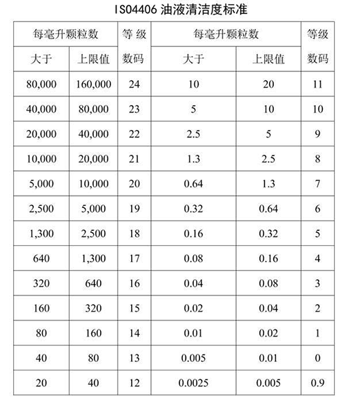 油液污染度常用國際ISO4406-1999污染度等級標準表示,它是以1ml潤滑油中顆粒數來表示,采用三個數碼代表污染度等級,前一數碼代表1ml油樣中尺寸大于4 μm的顆粒數等級,中間的數碼代表1ml油樣中尺寸大于6 μm的顆粒數等級,最后的數碼代表1ml油樣中尺寸大于14 μm的顆粒數等級。