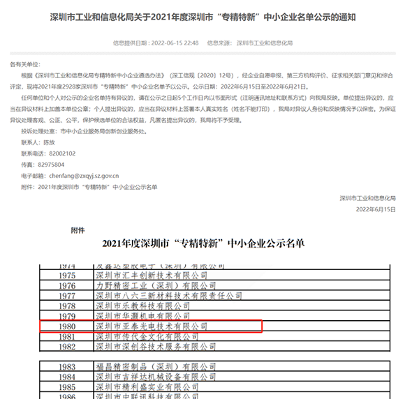 近日,深圳市工業(yè)和信息化局發(fā)布了《關(guān)于2021年度深圳市“專精特新”中小企業(yè)名單公示的通知》,深圳市亞泰光電技術(shù)有限公司名列榜中。