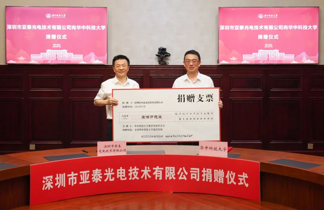 2025年7月17日,在華中科技大學梧桐語論道廳內,一場意義非凡的校企合作拉開了帷幕。作為國家級專精特新“小巨人”企業,深圳市亞泰光電技術有限公司向其母?!A中科技大學慷慨捐贈了100萬元人民幣設立“亞泰光電獎教獎學金”,旨在支持教育事業的發展,推動科技人才的培養。此次捐贈不僅是對母校深厚情感的體現,更是未來校企合作邁向新高度的重要里程碑。