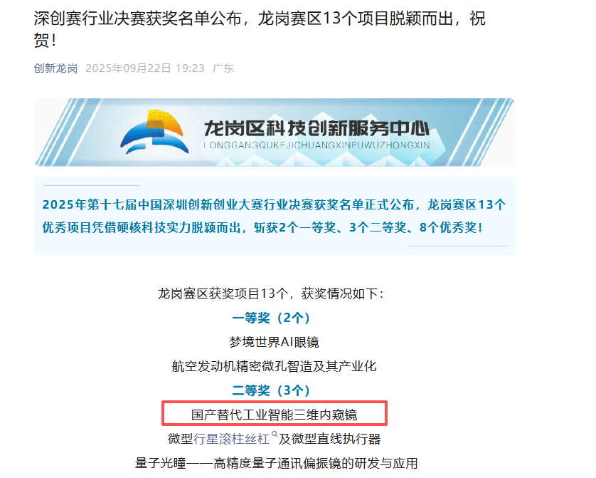 近日,第十七屆中國(guó)深圳創(chuàng)新創(chuàng)業(yè)大賽總決賽圓滿落幕,賽場(chǎng)傳來(lái)振奮人心的喜訊!深圳亞泰光技術(shù)有限公司憑借其自主研發(fā)的“國(guó)產(chǎn)替代工業(yè)智能三維內(nèi)窺鏡”項(xiàng)目,在眾多頂尖科創(chuàng)項(xiàng)目中一路過(guò)關(guān)斬將,最終勇奪大賽亞軍,榮獲二等獎(jiǎng)的優(yōu)異成績(jī)!這一榮譽(yù)不僅是對(duì)亞泰光技術(shù)實(shí)力的權(quán)威認(rèn)證,更標(biāo)志著我國(guó)在高端工業(yè)無(wú)損檢測(cè)裝備領(lǐng)域?qū)崿F(xiàn)重要突破。