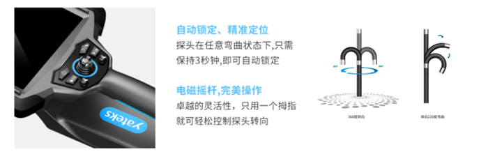 4、自動鎖定 精準定位——亞泰光電專利, 步進、快慢速調(diào)節(jié)和微調(diào)鎖定功能以及電動360°轉(zhuǎn)向控制,最大單向220°彎曲角度。